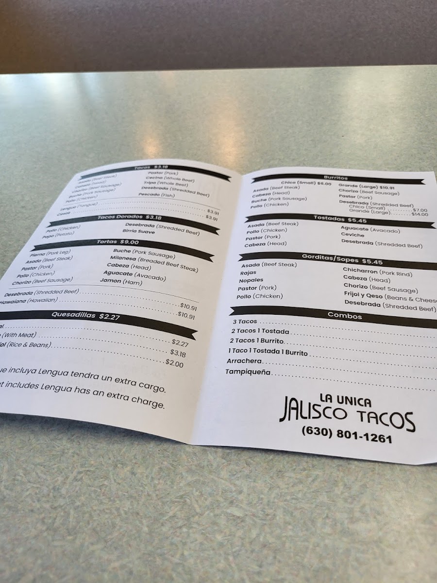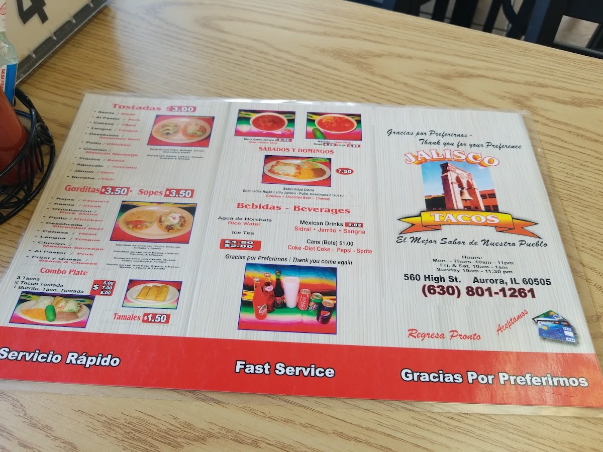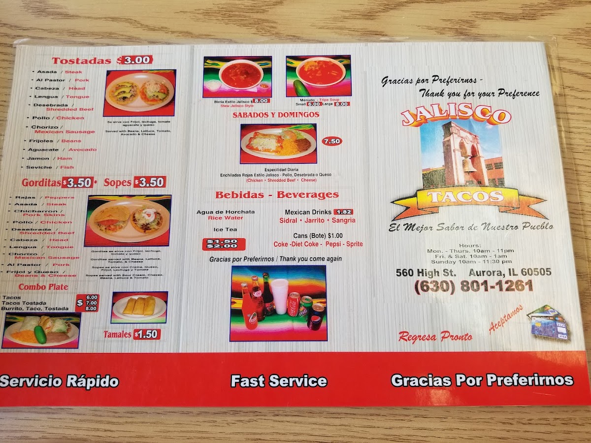 Jalisco Tacos in Aurora, IL, offers an authentic Mexican dining experience centered on fresh, bold flavors that truly satisfy taco lovers. Their menu shines with specialties like their deep-fried sope varieties—Al Pastor, Steak, Cabeza, and Chicharron—each generously topped with marinated meats, sour cream, beans, cheese, and crisp vegetables. Burritos, a staple here, come stuffed with savory options like skirt steak, beef head, pork stomach, and tender chicken, wrapped in soft flour tortillas that balance heartiness with fresh ingredients.